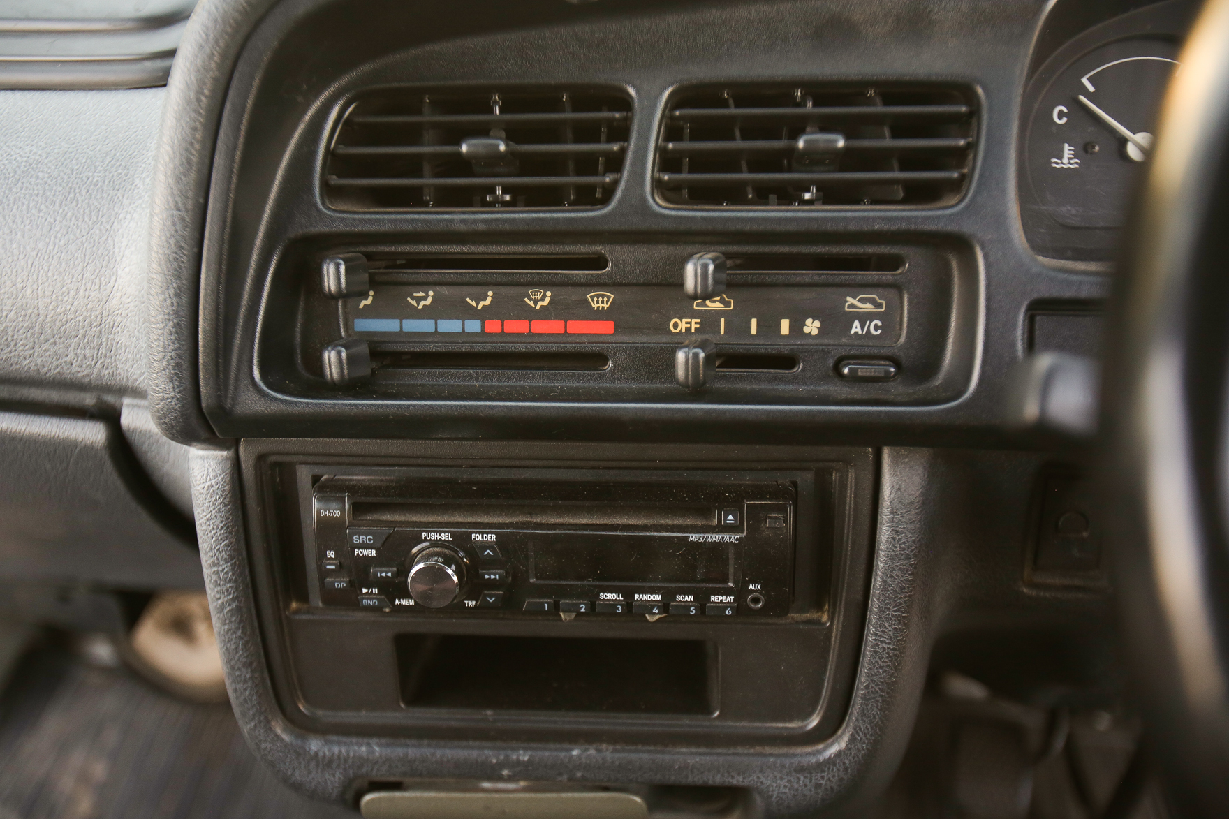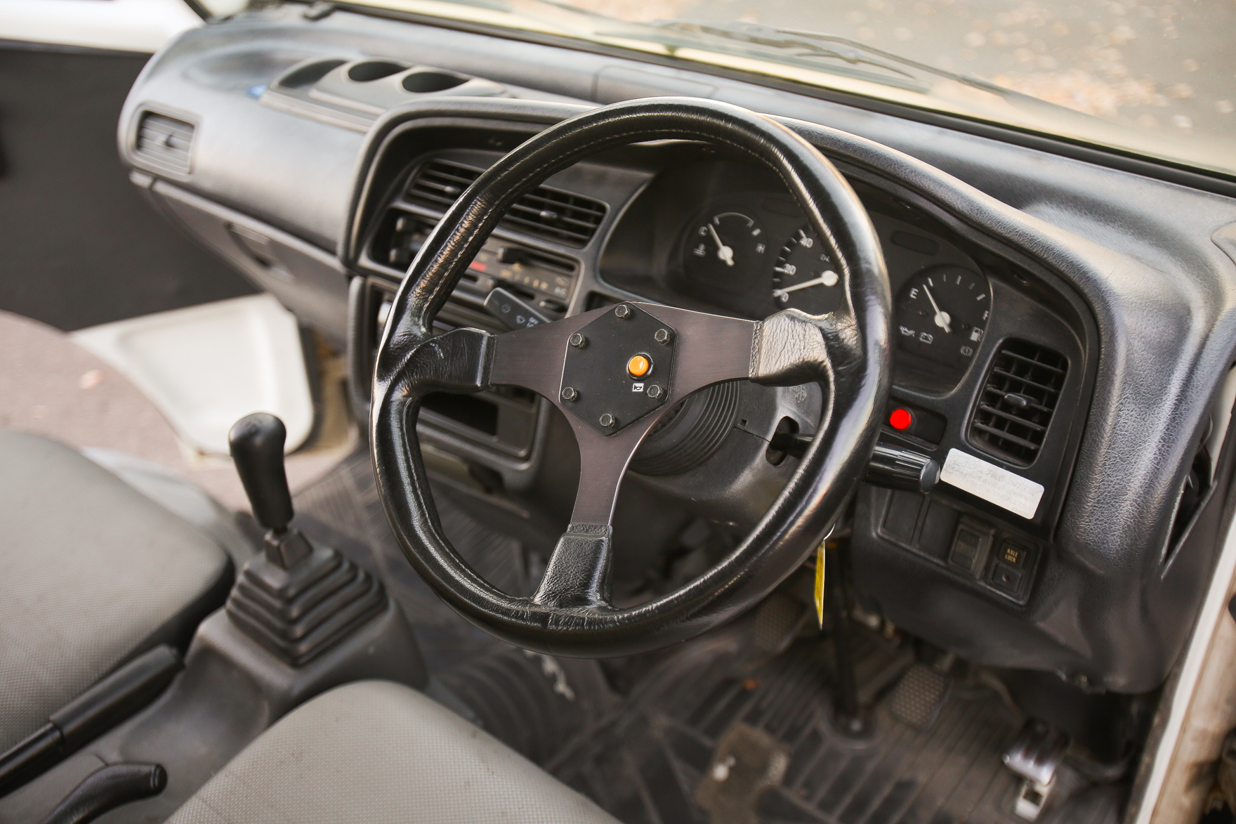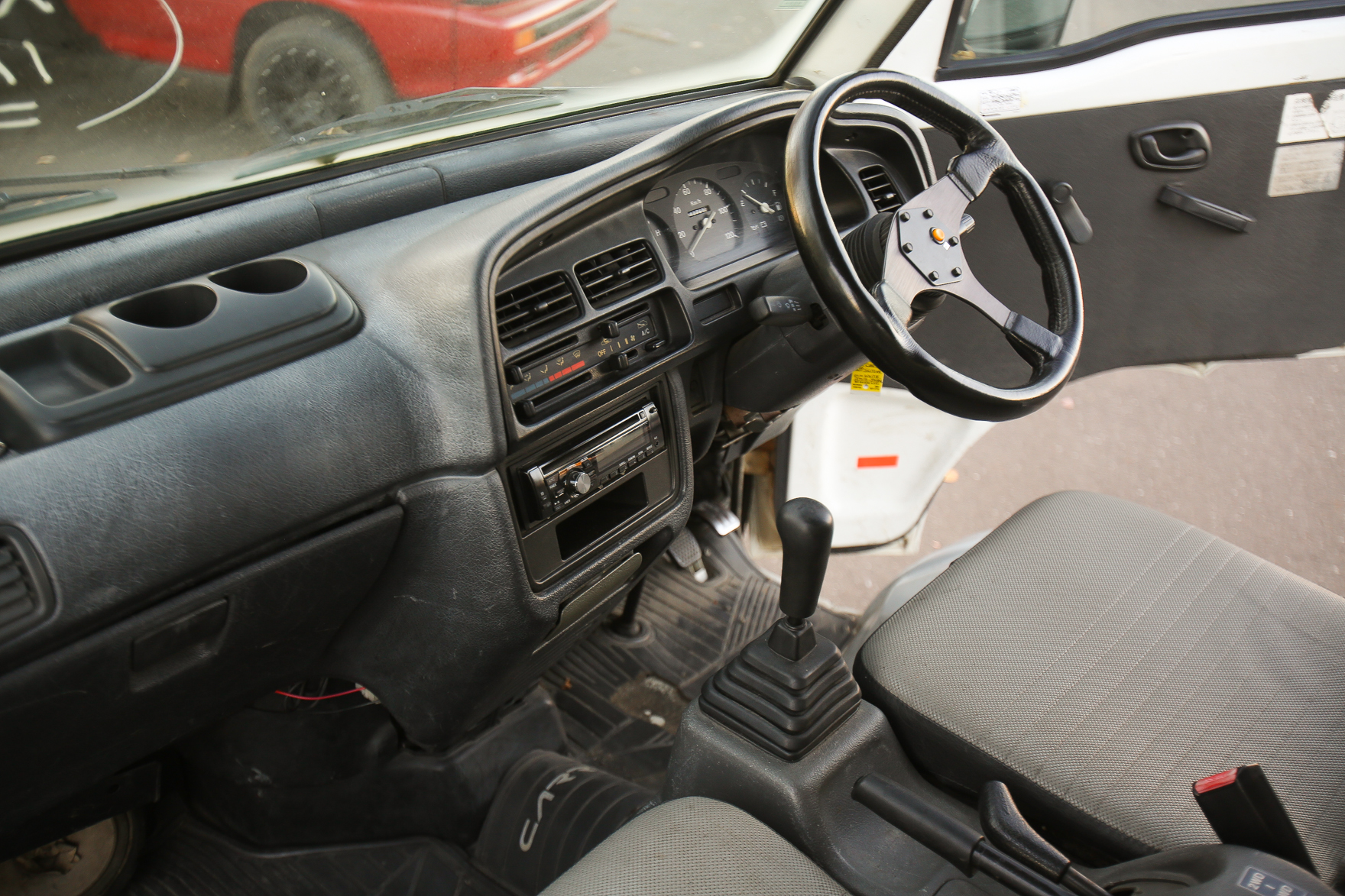 Heat, fan, defroster, manual roll up windows, windshield wipers, horn, hi-low beam headlights, tail lights, turn signals, 5speed manual transmission, bed with fold down sides,